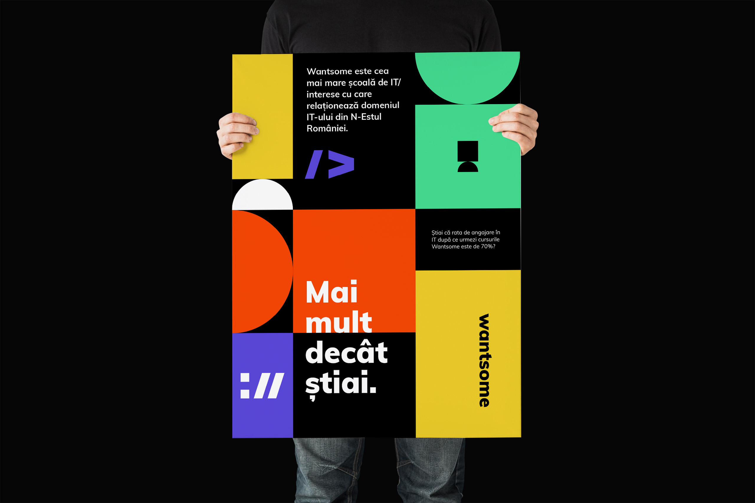 The IT industry in Iași saw an exponential growth in the past 10 years, with over 13.000 people working in tech companies locally. At one point, the human resource demand surpassed the offer, so companies like Wantsome started to emerge. Created in Iași with the help of people passionate about IT and willing to share their experience, the Wantsome academy has developed over the last 5 years as the top solution in alternative programming education and industry-related interests in North-East Romania. We had to create a brand that makes the field appealing to everyone, even though programming might seem scary. So we created a visual identity that is friendly, colorful and approachable. We used basic geometric shapes and combined them in layouts to take the potential client's imagination back to childhood memories, where they used colored blocks to learn and build things. The logo is a simple shape composed of a square and a semicircle that looks like a computer screen but also a human figure. We animated it and it became a distinguishable figure for the brand. We then created print and digital layouts that combine typography, shapes and tech icons. We used a flexible layout for the logo, not constraining it to a single arrangement. Wantsome has since become the leading tech academy in the region of Moldova, with over 70 mentors and a newly opened office in Bucharest.